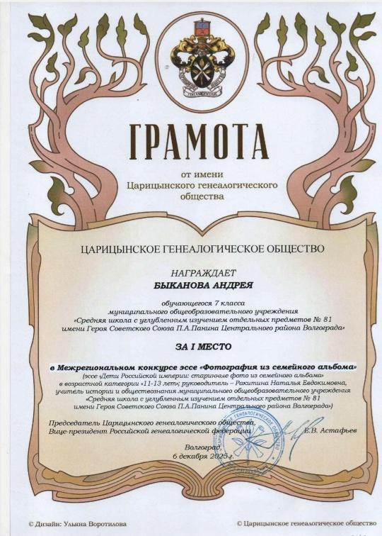 С огромной радостью и гордостью сообщаем, что ученик 7 "Б" класса нашей школы, Андрей Быканов, стал абсолютным победителем Межрегионального конкурса эссе «Фотография из семейного альбома»! Конкурс, в котором Андрей продемонстрировал свой талант и глубокое понимание темы, проходил 6 декабря...
